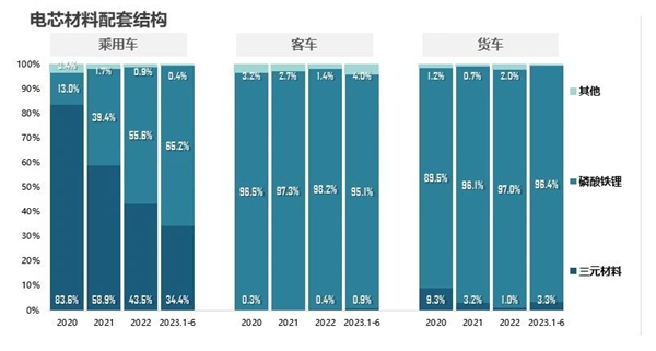 2023年1-6月, 乘用車領(lǐng)域,磷酸鐵鋰電芯配套率達(dá)65.2%,而商用車領(lǐng)域中基本已完成了對其他材料電芯的替代。