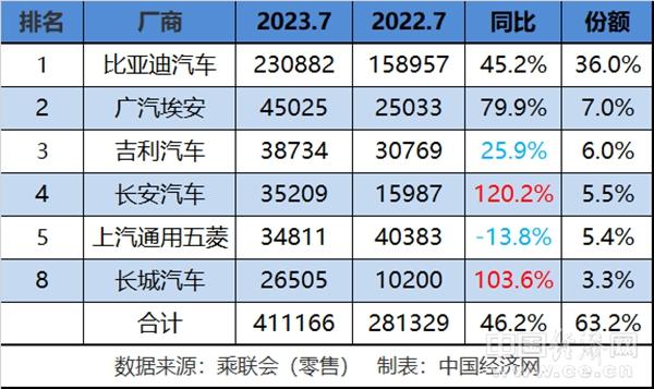 傳統(tǒng)新能源延續(xù)著近幾個(gè)月來的競(jìng)爭(zhēng)格局。7月,6家上榜的傳統(tǒng)品牌合計(jì)銷量達(dá)411166輛,同比增長(zhǎng)46.2%;其中,比亞迪、廣汽埃安穩(wěn)居前兩名,吉利、長(zhǎng)安、上汽通用五菱、長(zhǎng)城銷量均在3萬輛上下。前7月,傳統(tǒng)新能源依然是這6家企業(yè)上榜,合計(jì)銷量超過231萬輛,同比增長(zhǎng)59.2%。