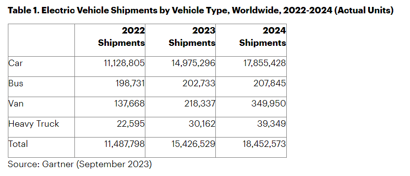Gartner 表示如果計(jì)算汽車、巴士、貨車和重型卡車在內(nèi),所有電動(dòng)類型的汽車出貨量為 1542 萬(wàn)輛;明年將達(dá)到 1845 萬(wàn)輛。