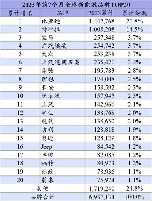 再從品牌榜單來看,得益于宋、秦Plus、元plus、海豚和海鷗等主銷車型,在國內(nèi)和海外市場的雙重發(fā)力,7月比亞迪又一次刷新自身的最高紀(jì)錄達(dá)到25.0萬輛,前7個月的總銷量也達(dá)到144.3萬輛。