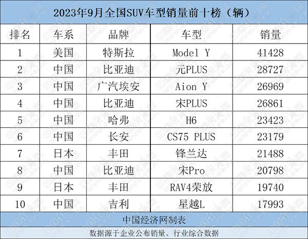 9月SUV:Model Y一馬當(dāng)先,比亞迪三車(chē)銷(xiāo)量超2萬(wàn)輛