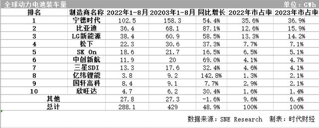 根據(jù)市場研究機(jī)構(gòu)SNE Research公布的全球動力電池裝車數(shù)據(jù)。2023年1—8月,全球動力電池裝車量為429GWH,同比增長48.9%。中國六家電池企業(yè)入名前十,整體市占率63.1%,較去年同期的58.1%增加5個(gè)百分點(diǎn)。