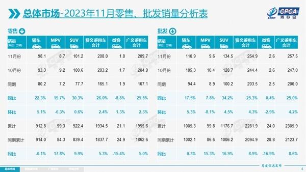 11月,國(guó)內(nèi)狹義乘用車生產(chǎn)、批發(fā)、零售端皆呈現(xiàn)同環(huán)比雙增長(zhǎng)的有力表現(xiàn),并連續(xù)第三個(gè)月齊齊站上200萬輛關(guān)口。1-11月,狹義乘用車生產(chǎn)、批發(fā)、零售累計(jì)增速繼續(xù)擴(kuò)大,分別達(dá)到7.4%、8.9%和5.3%,較1-10月各自提升1.9、1.7和2.1個(gè)百分點(diǎn)。