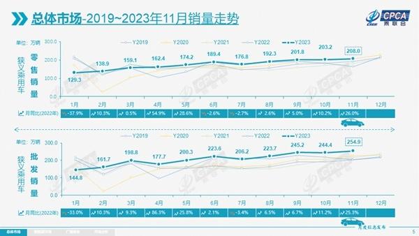 零售方面,11月,狹義乘用車共售出208.0萬輛,同比增長(zhǎng)26.0%,環(huán)比增長(zhǎng)2.4%;1-11月累計(jì)零售量達(dá)1934.5萬輛,同比增長(zhǎng)5.3%。乘聯(lián)會(huì)秘書長(zhǎng)崔東樹分析, “近年來,乘用車市場(chǎng)在年末持續(xù)升溫已成為常態(tài)走勢(shì),這主要是受新能源車持續(xù)增長(zhǎng)以及小批量國(guó)六a車型清庫存推動(dòng)。今年11月,車市促銷力度維持較高水平,地方補(bǔ)貼頻出,因此乘用車銷量繼續(xù)抬升。”