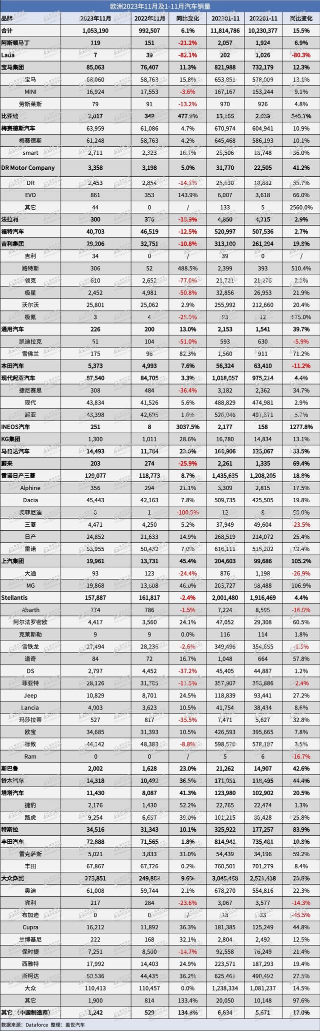 根據(jù)市場研究機(jī)構(gòu)Dataforce的初步數(shù)據(jù),11月份,歐洲新車銷量同比上漲6.1%,超過105萬輛。