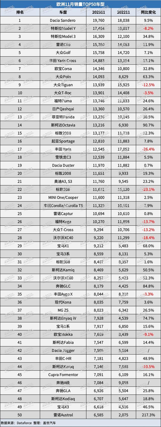 就車型而言,Dataforce的初步數(shù)據(jù)顯示,Dacia Sandero在11月成為歐洲最暢銷的車型。這是該車型連續(xù)兩個(gè)月成為歐洲最暢銷的車型,并且在今年1月至11月期間第4次成為月度暢銷車型。