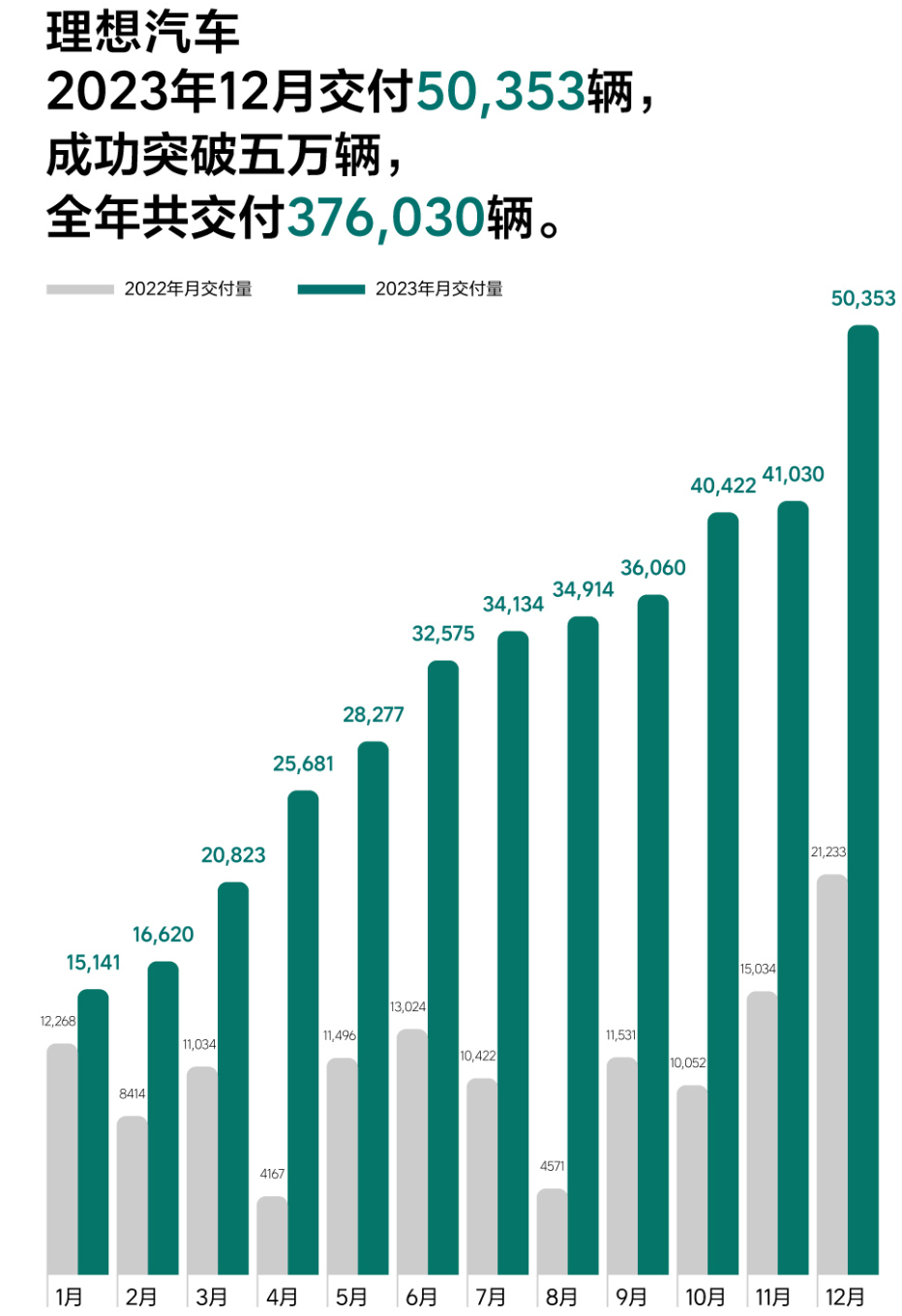 作為新勢(shì)力的代表,理想汽車今年表現(xiàn)也同樣亮眼。其公布的數(shù)據(jù)顯示,2023年12月,理想汽車交付新車5.04萬(wàn)輛,同比增長(zhǎng)137.1%。這也是理想汽車首次月交付超過(guò)5萬(wàn)大關(guān),兌現(xiàn)了CEO李想此前的承諾。整體來(lái)看,理想在2023年累計(jì)交付37.6萬(wàn)輛,同比增長(zhǎng)182.2%。截至2023年12月31日,理想汽車?yán)塾?jì)交付量超60萬(wàn)輛,是交付量最高的新勢(shì)力車企。