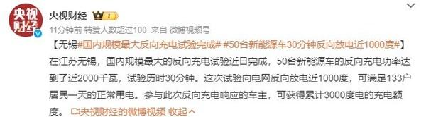 1月5日,據(jù)央視報(bào)道,近日在江蘇無(wú)錫,國(guó)內(nèi)規(guī)模最大的反向充電試驗(yàn)完成,50臺(tái)新能源車(chē)的反向充電功率達(dá)到了近2000千瓦,試驗(yàn)歷時(shí)30分鐘。這次試驗(yàn)向電網(wǎng)反向放電近1000度,可滿(mǎn)足133戶(hù)居民一天的正常用電。參與此次反向充電響應(yīng)的車(chē)主,可獲得累計(jì)3000度電的充電額度。