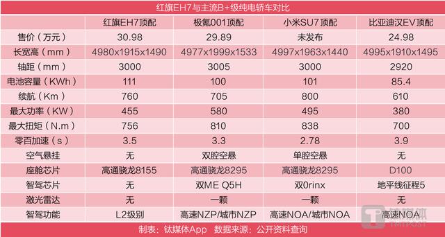 三電方面,紅旗為EH7配備了一塊111度的超大電池,電池容量是同級(jí)車型中的最大,這讓EH7的續(xù)航能力位居前列,CLTC續(xù)航達(dá)到760公里;EH7四驅(qū)版的動(dòng)力性能與極氪001和小米SU7不相上下,值得指出的是,紅旗表示EH7的電機(jī)最高轉(zhuǎn)速達(dá)到22500轉(zhuǎn)/分鐘,是量產(chǎn)車型中的行業(yè)第一,此前小米在SU7的技術(shù)發(fā)布會(huì)上也有過類似表述。EH7的零百加速也達(dá)到了3秒級(jí),為3.5秒,不及極氪001和小米SU7的3.3秒和2.78秒,但好于比亞迪漢EV的3.9秒。