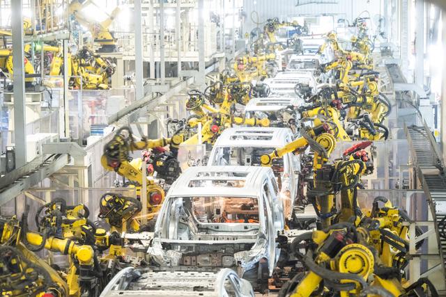 4月1日,在位于湖北武漢經(jīng)開區(qū)的嵐圖汽車電動(dòng)化焊裝車間,機(jī)器人在流水線上作業(yè)。新華社記者肖藝九攝
