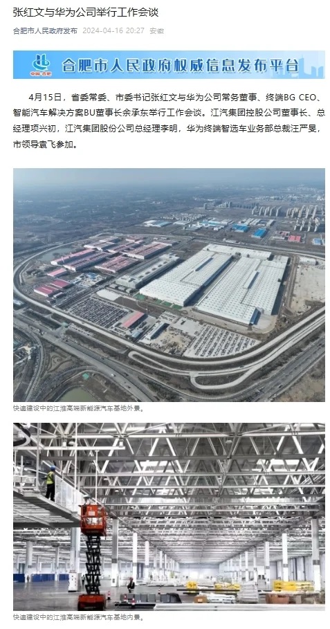 2023年12月,江淮汽車發(fā)布公告稱,與華為終端有限公司簽署《智能新能源汽車合作協(xié)議》。雙方將基于華為智能汽車解決方案,在產(chǎn)品開發(fā)、生產(chǎn)制造、銷售、服務等多個領域全面合作,著力打造豪華智能網(wǎng)聯(lián)電動汽車。