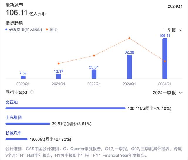 今年一季度,比亞迪收獲了一份營收1249億元、歸母凈利潤45.69億元的“雙增長”財報,但更令人關(guān)注的卻是它在研發(fā)投入上的驚人數(shù)字。