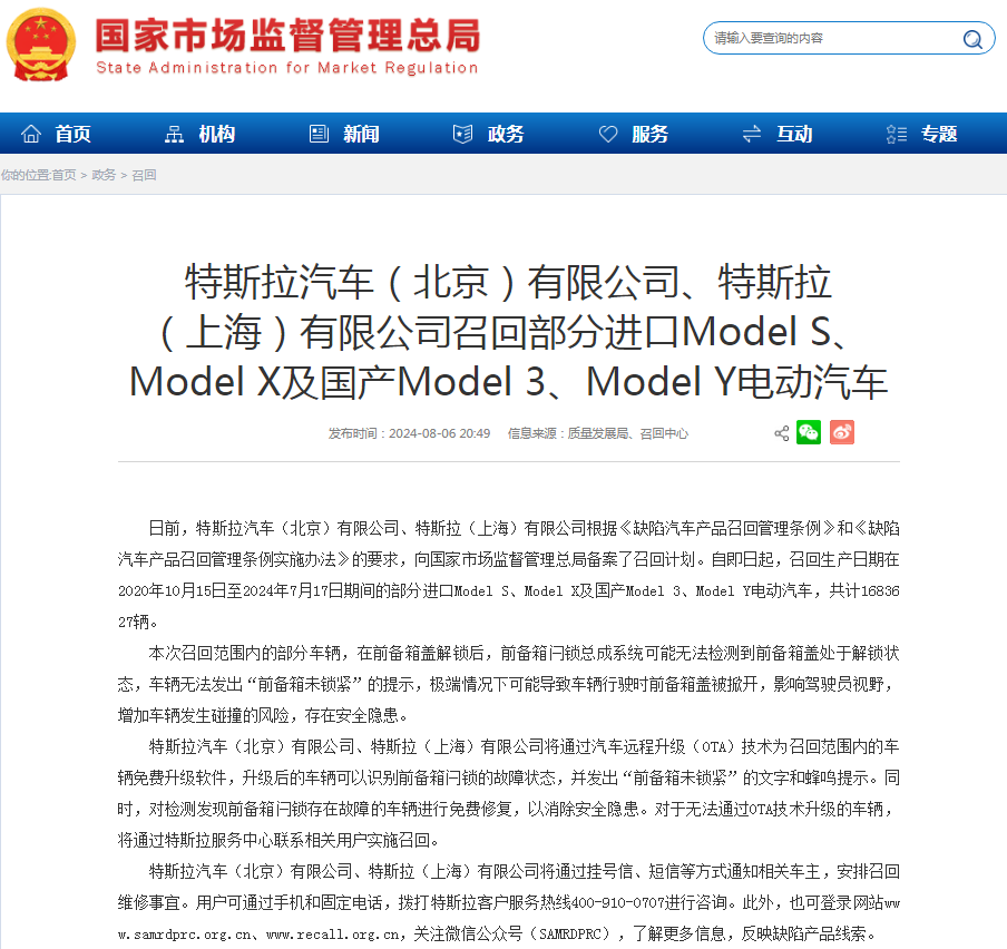 據(jù)市場(chǎng)監(jiān)管總局6日消息,特斯拉汽車(chē)(北京)有限公司、特斯拉(上海)有限公司根據(jù)《缺陷汽車(chē)產(chǎn)品召回管理?xiàng)l例》和《缺陷汽車(chē)產(chǎn)品召回管理?xiàng)l例實(shí)施辦法》的要求,近日向市場(chǎng)監(jiān)管總局備案了召回計(jì)劃:自即日起,召回生產(chǎn)日期在2020年10月15日至2024年7月17日期間的部分進(jìn)口Model S、Model X及國(guó)產(chǎn)Model 3、Model Y電動(dòng)汽車(chē),共計(jì)1683627輛。