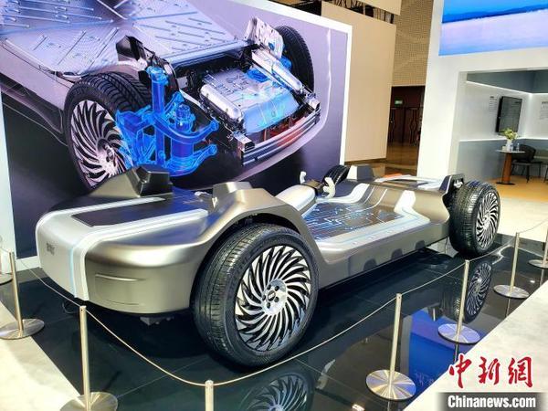 9月27日,為期三天的2024世界新能源汽車大會在海口開幕。圖為車企在全球新能源汽車產(chǎn)品及技術展上展示的新能源汽車底盤。中新社記者 王曉斌 攝