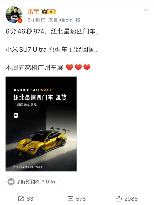 11月12日,雷軍在微博高調(diào)宣布:“小米SU7 Ultra原型車已經(jīng)回國(guó),并將于廣州車展上正式亮相。”據(jù)了解,該車定位為巔峰性能科技轎車,定價(jià)為81.49萬(wàn)元。然而,即便如此,在預(yù)訂開(kāi)啟僅10分鐘內(nèi),小訂量就突破了3680臺(tái)。