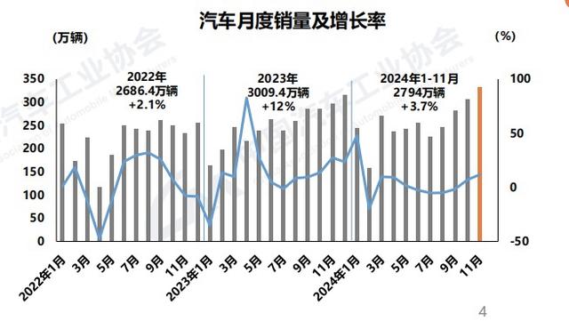 中汽協(xié)數(shù)據(jù)顯示,1~11月,我國汽車產(chǎn)銷分別完成2790.3萬輛和2794萬輛,同比分別增長2.9%和3.7%,汽車產(chǎn)量增速較1~10月擴大1.1個百分點,銷量增速擴大1個百分點。