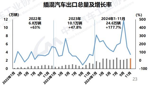 細分來看,插電式混合動力汽車出口增速已遠超純電動汽車。數(shù)據(jù)顯示,1~11月,我國純電動汽車出口89.4萬輛,同比下降10.8%;插電式混合動力汽車出口24.6萬輛,同比增長1.8倍。其中,11月,純電動汽車出口5.8萬輛,環(huán)比下降43.8%,同比下降29.2%;插電式混合動力汽車出口2.5萬輛,環(huán)比增長1.9%,同比增長74.3%。