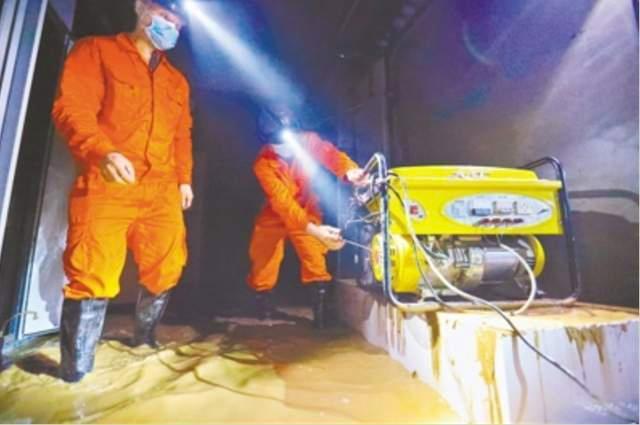 搶修人員在天倫灣小區(qū)進行抽水、烘干設備等系列搶修