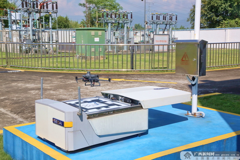 “氣象條件滿(mǎn)足飛行要求,數(shù)據(jù)傳輸信號(hào)穩(wěn)定,無(wú)人機(jī)準(zhǔn)備完畢,可以起飛!”10月25日上午,玉林供電局變電站值班員黃陽(yáng)運(yùn)通過(guò)輸變配一體系統(tǒng),遠(yuǎn)程下發(fā)巡視指令。無(wú)人機(jī)便緩緩飛入空中,按照固定的航線對(duì)110千伏江濱變電站內(nèi)的保供電設(shè)備進(jìn)行了全面、細(xì)致的巡視。