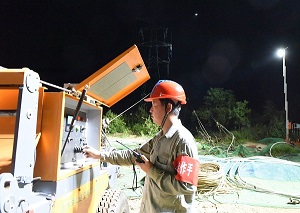 中國電力網訊 8月11日凌晨1時,在武漢黃陂區(qū)蔡家榨街道周里河,由湖北送變電工程有限公司承建的武漢1000千伏變電站配套500千伏線路送出工程N30-N31跨越滬蓉高鐵架線施工現場, 面臨高鐵“空窗”時間極短、氣溫炎熱等困難,該公司加強事前籌劃和作業(yè)中安全管控督導,運用集控智能可視化系統(tǒng)對牽張設備進行操作和監(jiān)控,投入無人機空中照明系統(tǒng)等新裝備助力夜間施工,地面人員認真展放導線,鐵塔上的工人一絲不茍進行高空作業(yè),全體施工人員密切協同,打響夜間施工攻堅戰(zhàn)。(郭暉、余幫節(jié))