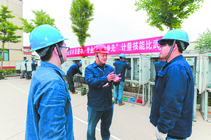 張遠(yuǎn)平(左)在計(jì)量專業(yè)技能比武活動(dòng)現(xiàn)場,向選手講解裝表接電技術(shù)要點(diǎn)。黃曉東 攝