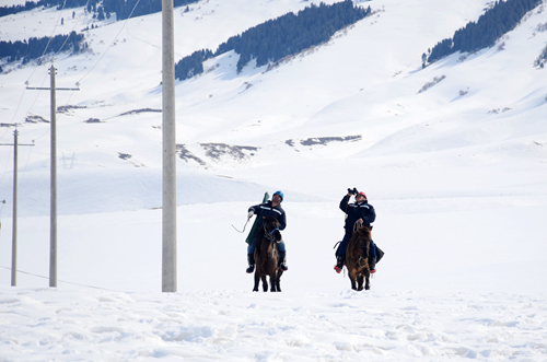 阿曼吐爾·依沙木丁帶領供電所員工冬季騎馬巡視天山腳下的供電線路。(國網(wǎng)伊犁伊河供電公司供圖)
