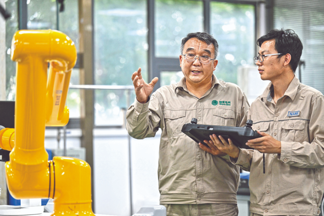 張黎明(左)和同事研發(fā)配網(wǎng)帶電作業(yè)機(jī)器人。趙子碩 攝