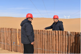 李平帶頭設(shè)計(jì)研究安裝防風(fēng)固沙柵欄,保護(hù)輸電鐵塔免遭風(fēng)沙侵移損壞。