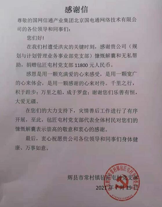 中國(guó)電力網(wǎng)訊 (通訊員 朱友宇) “在您們的大力支持下,災(zāi)情善后工作進(jìn)行了有序開(kāi)展,至此,氈匠屯村黨支部代表全體村民對(duì)您們的慷慨解囊表示崇高的敬意和衷心的感謝”,輝縣市常村鎮(zhèn)氈匠屯村黨支部在感謝信中寫(xiě)道。7月29日,國(guó)網(wǎng)信通產(chǎn)業(yè)集團(tuán)國(guó)電通規(guī)劃與計(jì)劃管理業(yè)務(wù)事業(yè)部黨支部收到了一封特殊的感謝信,這封信不是來(lái)自用戶(hù)的,也不是來(lái)自上級(jí)單位的,它來(lái)自輝縣市常村鎮(zhèn)氈匠屯村黨支部。