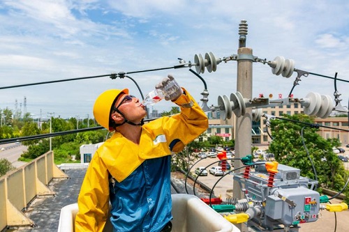 國(guó)網(wǎng)山東濟(jì)寧供電公司員工在烈日高溫下完成智能開關(guān)更換作業(yè)后補(bǔ)充水分。