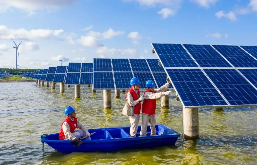 ▲國網(wǎng)江蘇南通供電公司員工在“漁光互補”光伏電站巡檢光伏發(fā)電設(shè)備。