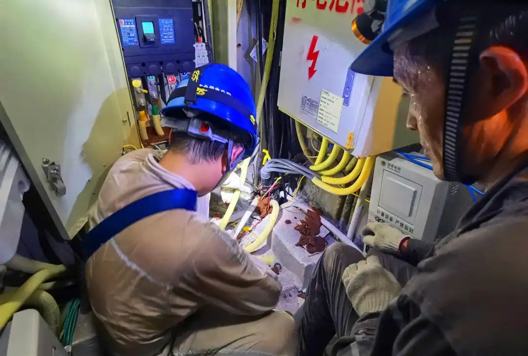 國(guó)家電網(wǎng)員工在居民小區(qū)電井中排查隱患。