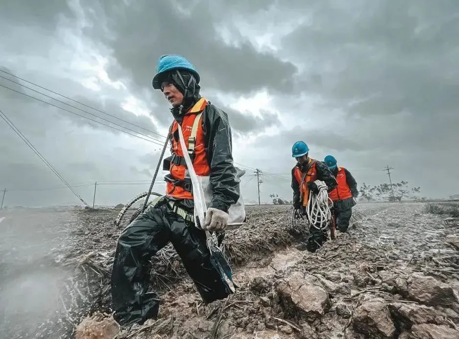 臺風(fēng)“梅花”在浙江舟山普陀沿海登陸后,國網(wǎng)浙江電力員工穿過泥濘的田地前往故障點(diǎn)開展搶修。程夢玨 攝