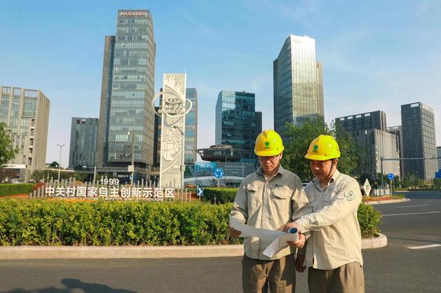 國(guó)網(wǎng)北京亦莊供電公司員工在北京經(jīng)開區(qū)中關(guān)村國(guó)家自主創(chuàng)新示范區(qū)巡檢重點(diǎn)線路,保障高溫天氣下電網(wǎng)運(yùn)行平穩(wěn)。