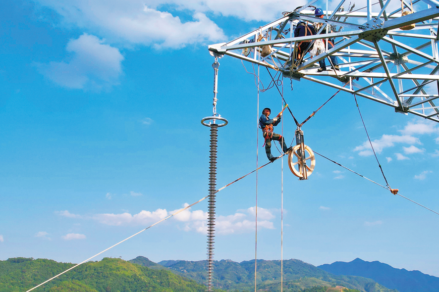 ▲國網(wǎng)福建電力施工人員在福建—廈門特高壓交流工程建設(shè)現(xiàn)場安裝導(dǎo)地線附件