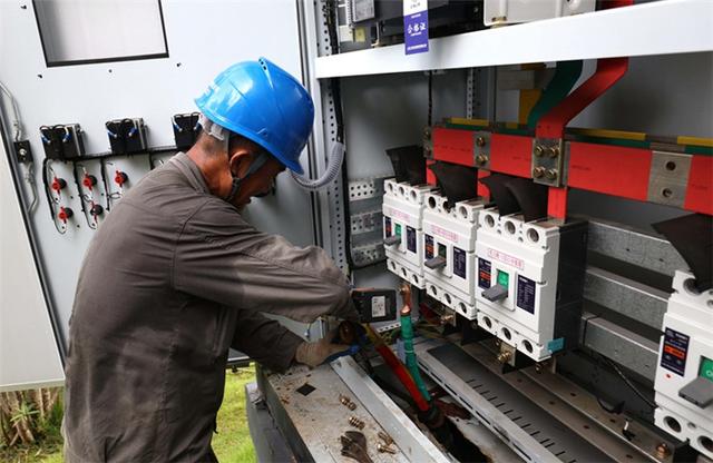 國(guó)網(wǎng)江蘇南通供電公司員工冒雨檢查閘口用電設(shè)備,確保安全運(yùn)行。