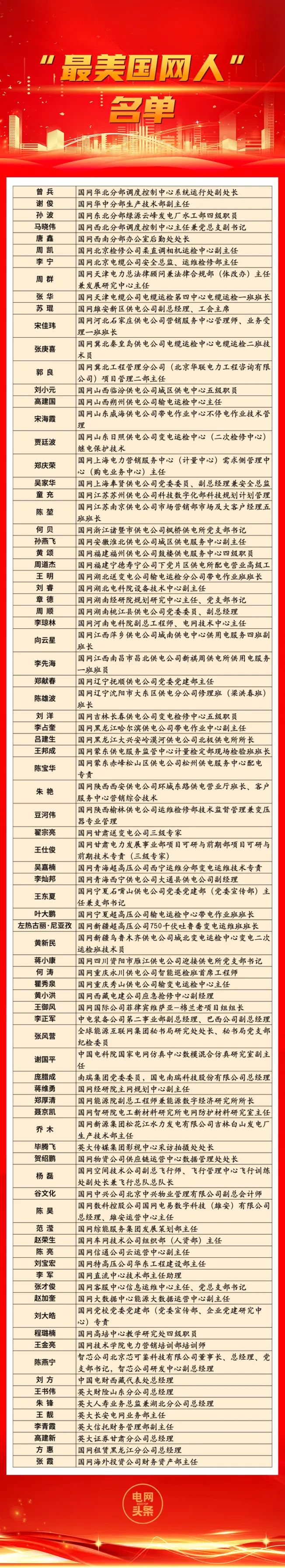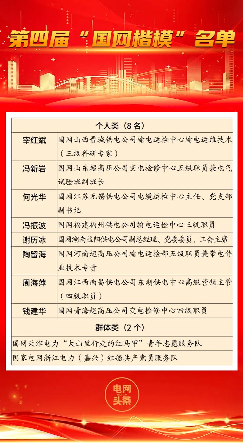 為深入學習貫徹習近平總書記關(guān)于黨的建設(shè)的重要思想和習近平文化思想,認真落實學習貫徹習近平新時代中國特色社會主義思想主題教育關(guān)于“學習身邊榜樣”活動要求,充分發(fā)揮先進典型示范引領(lǐng)作用,大力弘揚電力精神和電網(wǎng)鐵軍精神,凝聚推動公司“一體四翼”高質(zhì)量發(fā)展的強大合力,根據(jù)公司黨組統(tǒng)一部署,按照年度表彰計劃,公司組織開展了第五屆“國網(wǎng)楷模”評選活動,與第四屆“國網(wǎng)楷模”以及“最美國網(wǎng)人”一并發(fā)布。在各單位培育選樹、逐級推薦的基礎(chǔ)上,經(jīng)資格審查、聯(lián)評投票、專家評審及公示等環(huán)節(jié),公司黨組研究決定,授予宰紅斌等8名同志和國網(wǎng)天津電力“大山里行走的紅馬甲”青年志愿服務(wù)隊等2個群體第四屆“國網(wǎng)楷模”榮譽稱號,授予錢忠等8名同志和國網(wǎng)北京城區(qū)供電公司天安門政治供電服務(wù)中心等2個群體第五屆“國網(wǎng)楷模”榮譽稱號,授予曾兵等86名同志“最美國網(wǎng)人”榮譽稱號。