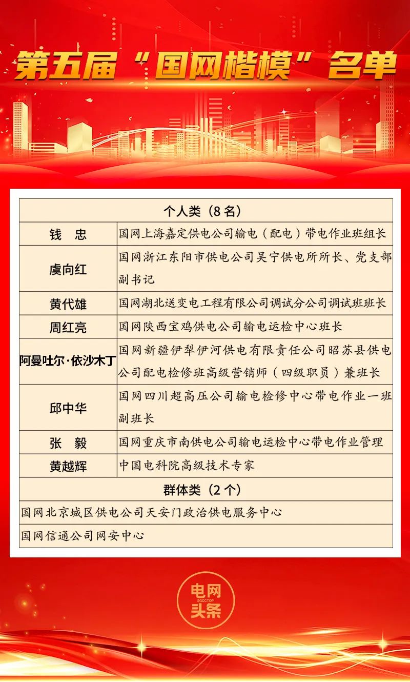 近日,國家電網(wǎng)有限公司黨組印發(fā)文件,授予8名個人和2個群體第四屆“國網(wǎng)楷模”榮譽稱號,授予8名個人和2個群體第五屆“國網(wǎng)楷模”榮譽稱號,授予86名個人“最美國網(wǎng)人”榮譽稱號。