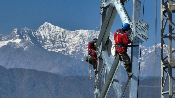 在四川甘孜藏族自治州瀘定縣,金沙江上游—湖北特高壓直流輸電工程建設(shè)正酣,電力施工人員在山脊上爭(zhēng)分奪秒組裝塔材。“我們所在的標(biāo)段處于高海拔重冰區(qū),新建的上百座鐵塔坡度均大于35度,最陡達(dá)65度,有的塔腿高差近20米,仿佛在‘刀背’上架鐵塔。”國網(wǎng)四川送變電公司項(xiàng)目經(jīng)理鄒忠旋介紹。這個(gè)全球海拔最高的特高壓直流輸電工程,投運(yùn)后每年可向華中地區(qū)輸送電量近400億千瓦時(shí),替代燃煤超1700萬噸。