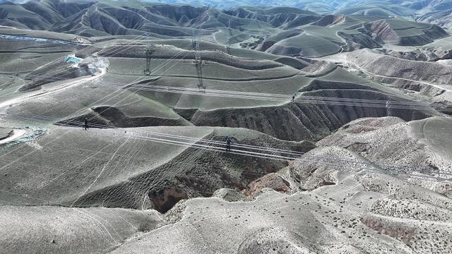 國網青海送變電公司施工人員在玉樹II回330千伏線路工程展放導線。