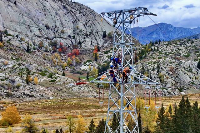 國網新疆阿勒泰供電公司施工人員在110千伏可可托海滑雪場線路工程組塔。