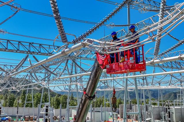 國網北京送變電有限公司施工人員在牌樓500千伏變電站新建工程現(xiàn)場安裝500千伏管母線跳線。