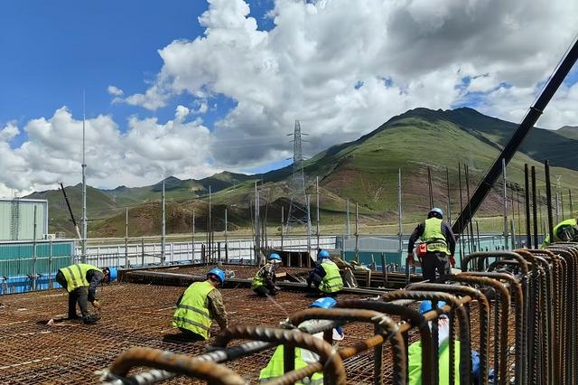 國網河南送變電建設有限公司施工人員在青藏聯(lián)網二期工程±400千伏拉薩換流站開展鋼筋綁扎作業(yè)。