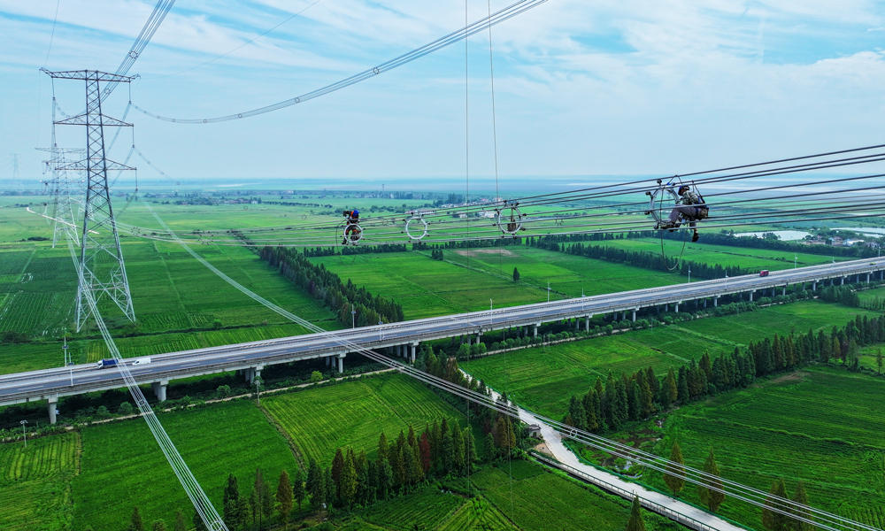 國家電網(wǎng)江蘇宿遷供電公司檢修人員在500千伏泗上線安裝防舞動相間間隔棒,提高供電可靠性。