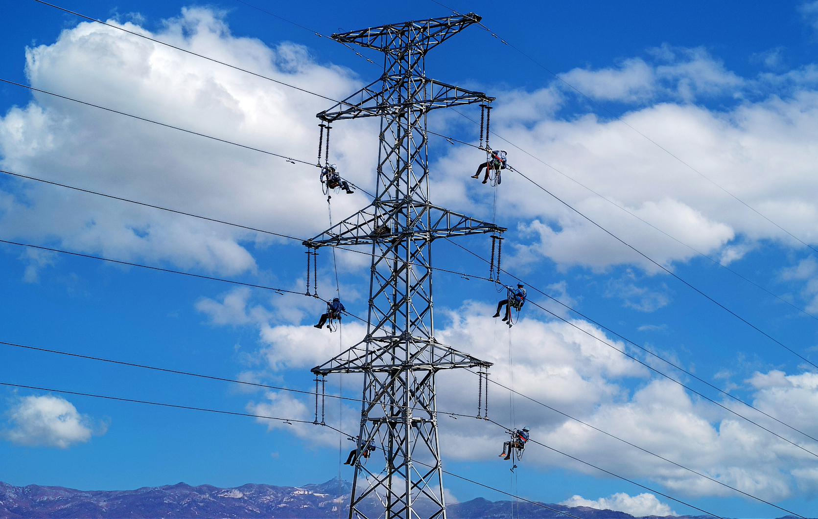 圖為國家電網(wǎng)山東威海供電公司工作人員在110千伏榮蜊線安裝防舞動間隔棒,確保度冬期間電網(wǎng)穩(wěn)定運行。