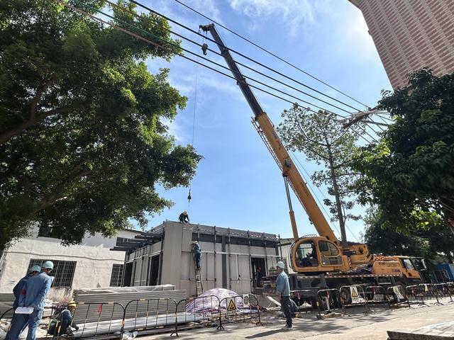 在施工技術(shù)上,江門蓬江供電局不僅引入了自動(dòng)化挖掘機(jī)、起重機(jī)、混凝土攪拌車等機(jī)械,還摒棄傳統(tǒng)配電站的磚瓦結(jié)構(gòu),采用高強(qiáng)度、輕質(zhì)、耐腐蝕的成品預(yù)制墻板及鋼結(jié)構(gòu)等新型建筑材料,結(jié)合裝配式施工工藝,減少以往現(xiàn)場(chǎng)焊接、切割等工藝帶來(lái)的環(huán)境污染,大大縮短了施工周期,還減少建筑垃圾的產(chǎn)生。“與傳統(tǒng)純?nèi)斯な┕し绞较啾?,本工程機(jī)械化率達(dá)到85%,工期壓縮了80%,大大減少了對(duì)附近居民的影響,也降低了施工過(guò)程中的安全隱患。”羅益榮說(shuō)。
