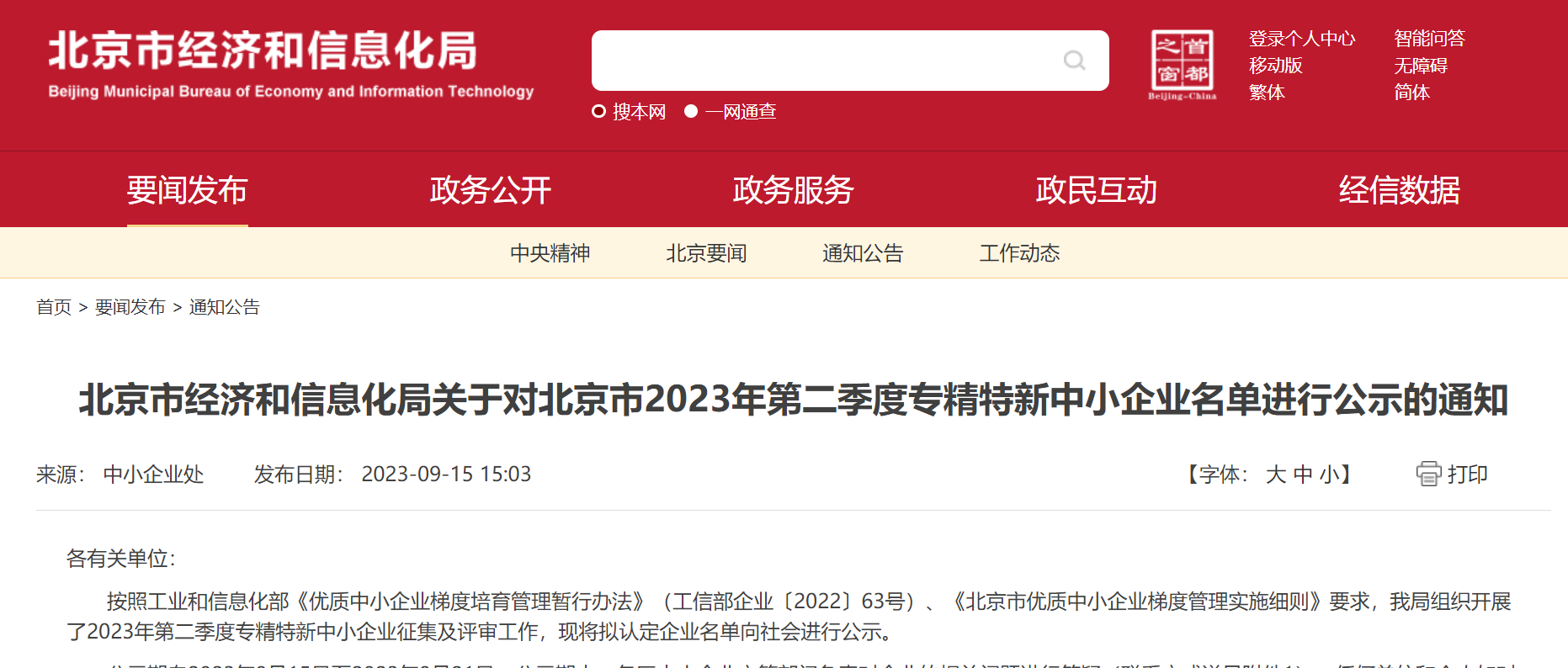 中國電力網(wǎng)訊(通訊員 時君柳) 9月15日,北京市經(jīng)濟和信息化局公布了《關(guān)于對北京市2023年第二季度“專精特新”中小企業(yè)名單進行公示的通知》,國網(wǎng)信通產(chǎn)業(yè)集團國電通憑借行業(yè)專業(yè)化、技術(shù)創(chuàng)新力、服務(wù)精細化從眾多參選企業(yè)中脫穎而出,獲得2023年度北京市“專精特新”中小企業(yè)榮譽稱號。