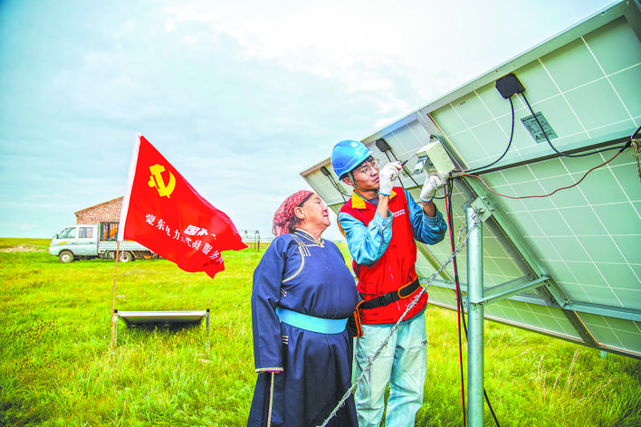 國家電網(wǎng)蒙東電力(呼倫貝爾新巴爾虎右旗)共產(chǎn)黨員服務隊隊員為牧民檢查光伏板。宋天培 攝