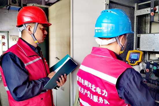 國網(wǎng)趙縣供電公司黨員服務(wù)隊(duì)隊(duì)員在趙縣中學(xué)檢查用電設(shè)施。 侯西果攝