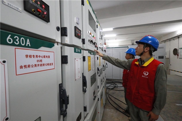 與此同時,在黃陂區(qū)第一中學,服務(wù)隊員仔細查看了校園內(nèi)的用電設(shè)備使用情況。由于暑假期間學校的電氣設(shè)備大多處于閑置無負荷狀態(tài),加之夏季高溫、暴雨等多種因素影響,開學后校園用電負荷將大幅增長,容易導致用電設(shè)備出現(xiàn)短路、漏電等安全隱患。服務(wù)隊員根據(jù)學校的實際情況,逐一檢查校內(nèi)配電室的高低壓柜、變壓器、備用電源以及教學樓、食堂等處的用電線路及用電設(shè)備,對學校內(nèi)部線路絕緣老化、進出線連接不規(guī)范、開關(guān)接觸不良等問題及時處理,積極配合校方進行整改,確保學校用電設(shè)備在開學之前全部正常運轉(zhuǎn)。“根據(jù)咱們學校的用電負荷特點,我們優(yōu)化了供電線路的布局,也合理調(diào)整了變壓器的運行檔位,制定了詳細的專項保供電方案,并與學校建立聯(lián)動機制,確保開學時的正常供電。”服務(wù)隊員一邊進行安全用電檢查,一邊對學校后勤相關(guān)負責人說道。